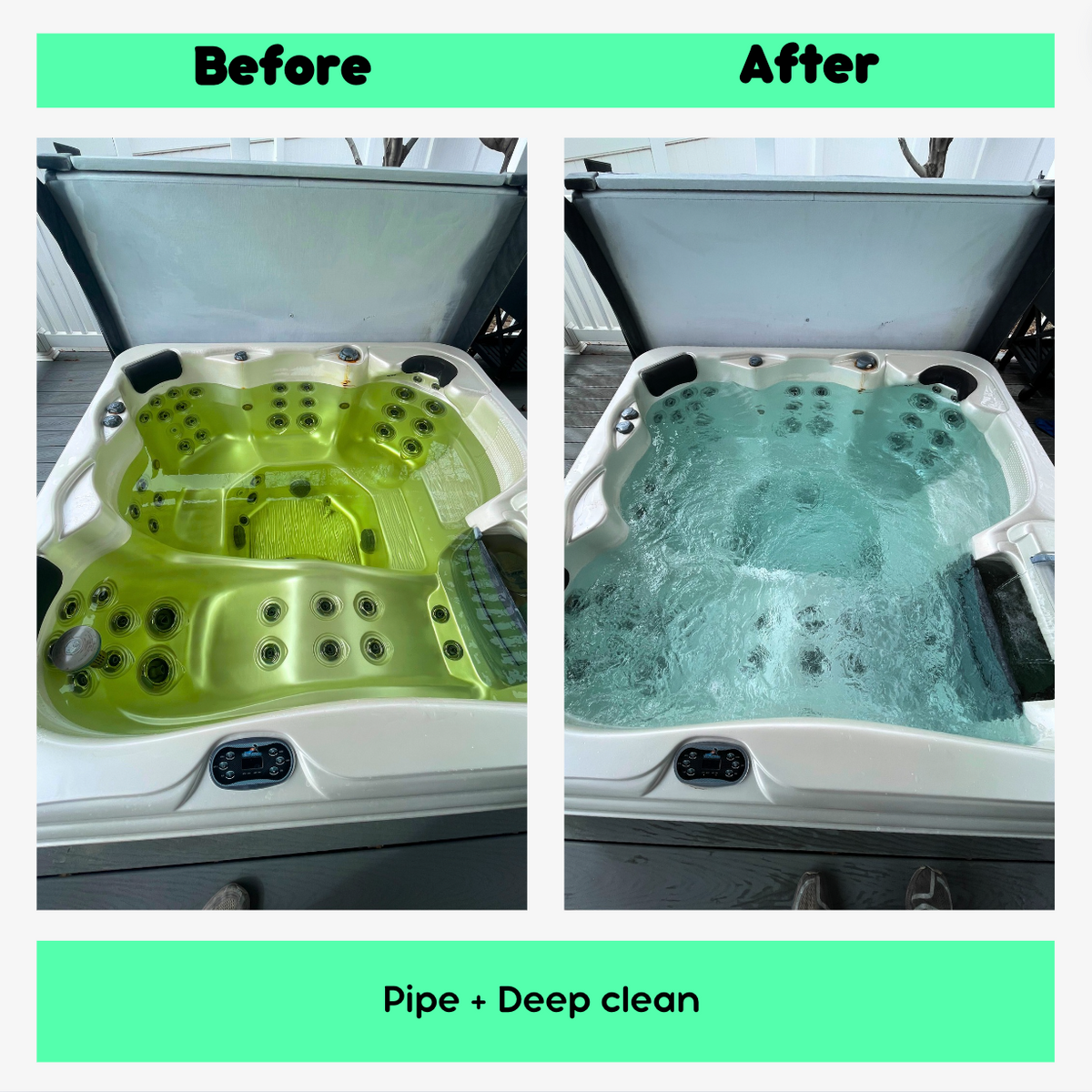 Pricing varies by hot tub size, but the average deep clean is around $350. This is a full hot tub restoration—we drain, pressure rinse, soap, hand scrub, rinse again, vacuum, refill, and rebalance your water for a fresh start. Cover, filter, and jetpack cleaning are all included for a complete reset. Mold removal included!